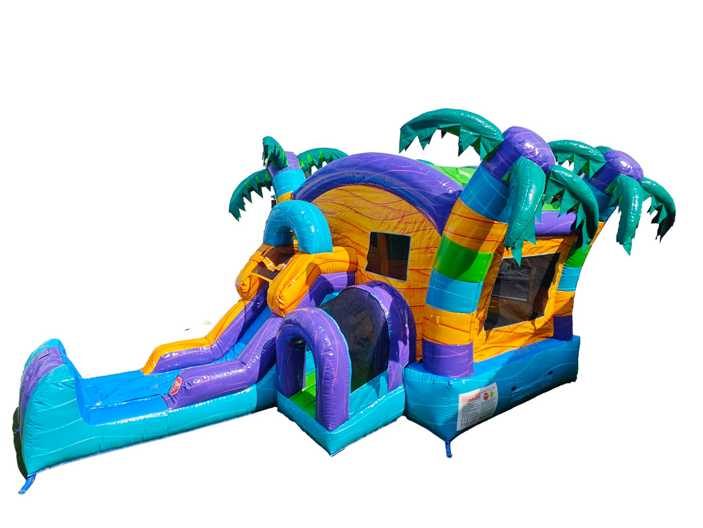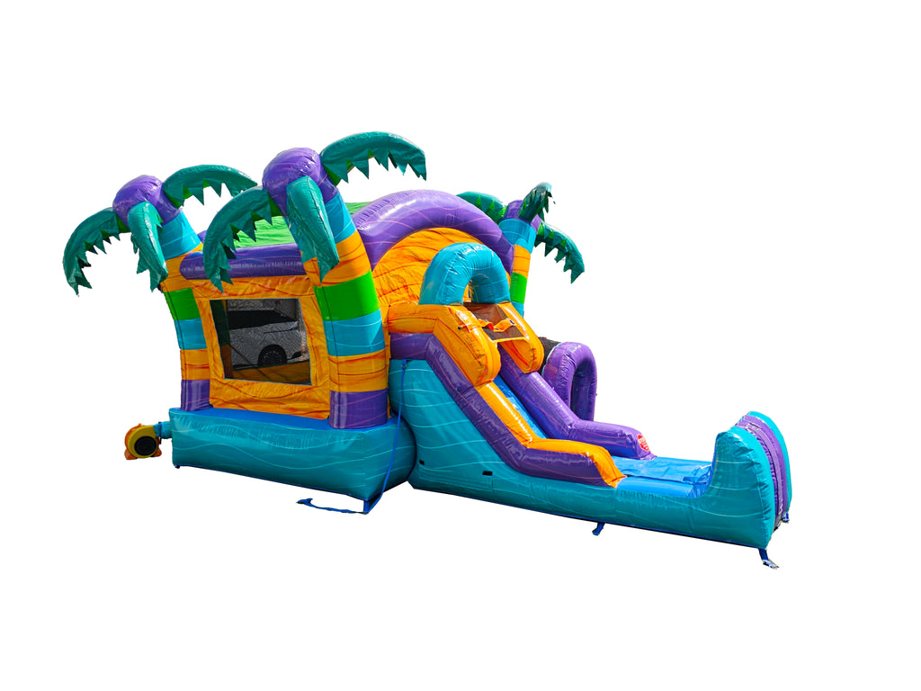 Featuring a spacious bounce area, climbing wall, and exciting slide, kids can enjoy hours of action whether used wet with a refreshing splash or dry for classic jumping fun. Palm tree accents, bright island colors, and playful tropical details make this combo an instant crowd favorite.